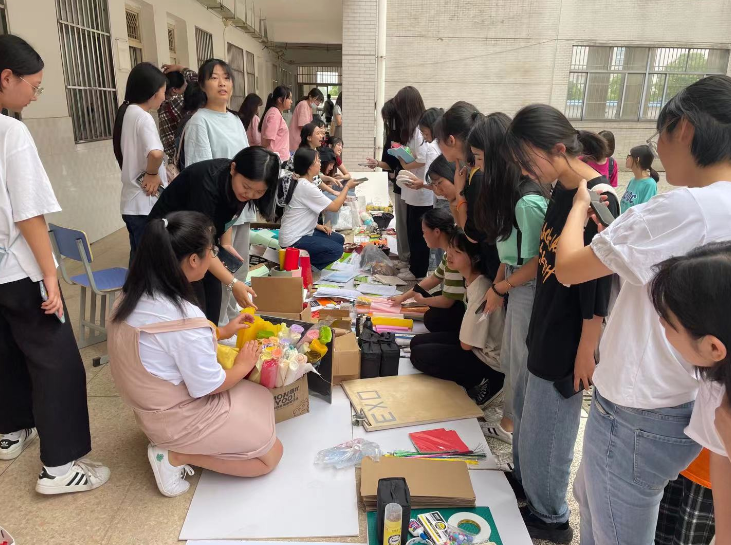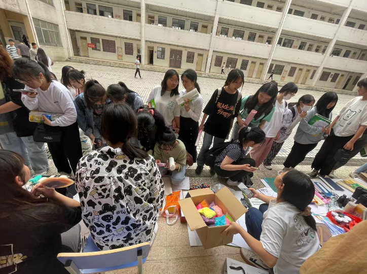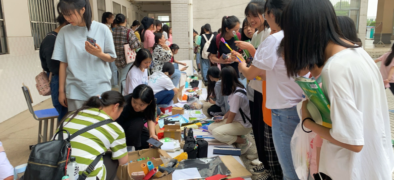 下午放学后,校园跳蚤市场盛大开幕。活动现场人头攒动,熙熙攘攘,叫卖声,欢笑声不绝于耳。各展位上的商品丰富多样、琳琅满目——生活用品、自制手工品、美术手工文具、二手文创用品、教师资格证考试材料等。学姐“小老板”们施展“绝招”,招揽顾客。学弟学妹们驻足观看、争相“淘宝”。整个过程热闹非凡而又秩序井然。