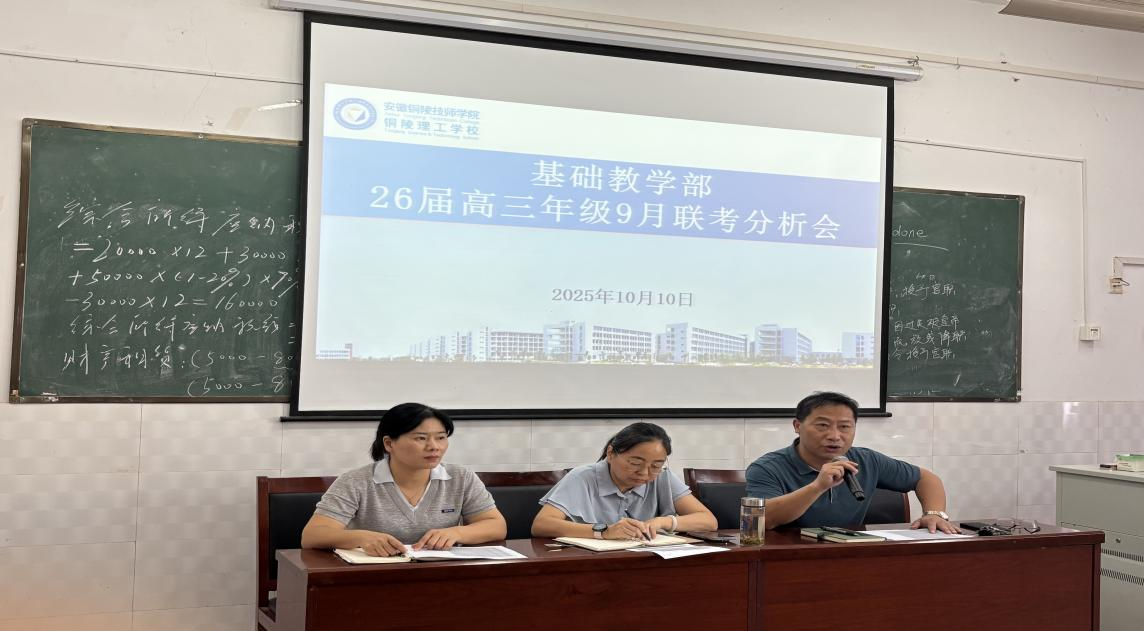 为全面复盘26届高三九月“江淮十校联考情况,明确下一阶段教学与管理方向,1010下午基础教学部在教学楼104会议室组织召开高三联考分析会。党委委员、副校长高阳,基础教学部部长赵志武,副部长章玉林以及全体高三教师参会。