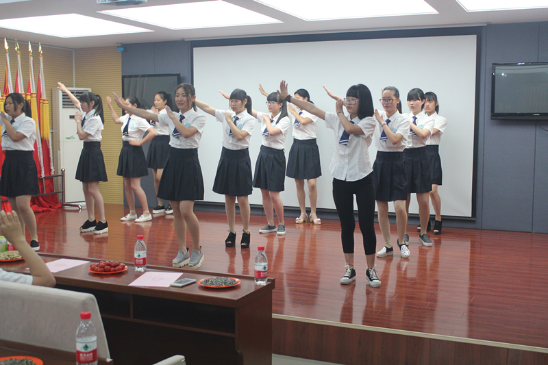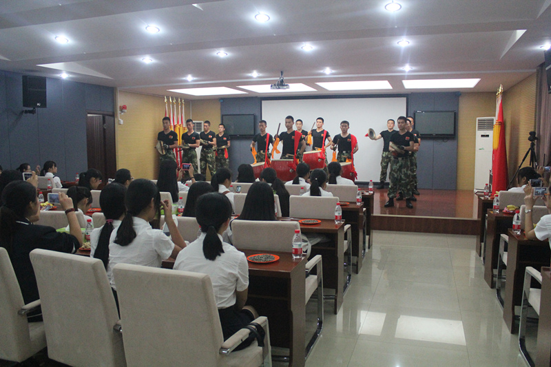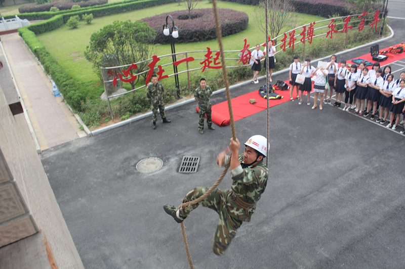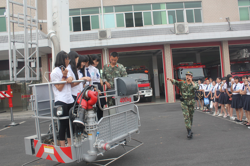 在中队魏指导员的带领下,同学们认真观摩了以弘扬战斗精神为主题的警营文化,参观了官兵内务设置,详细了解了官兵们日常的学习、训练、生活、工作等情况。紧接着,同学们来到了会议室,气势磅礴的锣鼓表演《单刀赴会》拉开了联欢会的序幕。官兵们和同学们表演了一个个精彩的节目,现场气氛热烈而温馨。去年该班的军训教官刘江平为同学们献上了一曲《不再犹豫》,将现场气氛推到了高潮。随后同学们观看了特勤中队自拍自导自演的微电影《舌尖上的消防兵之深夜的蛋炒饭》,微电影以时下流行的“舌尖体”,截取官兵深夜出警归来炒饭充饥的生活片段,充分展示了灭火救援、排险处突的消防警营生活,同学们被消防官兵的奋斗故事深深地打动了。最后,同学们来到了训练场,官兵们为同学们展示了作战技能,讲解员向同学们介绍了救援器材和逃生自救知识,组织同学们穿着作战服,并登上举高消防车平台,真实体验了一把“消防军人”生活。