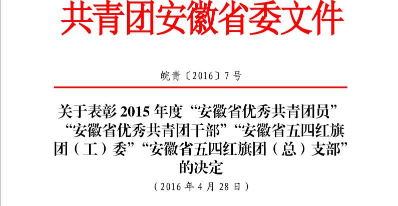 日前,根据共青团安徽省委皖青〔2016〕7号文件《关于表彰2015年度“安徽省优秀共青团员”“安徽省优秀共青团干部”“安徽省五四红旗团(工)委”“安徽省五四红旗团(总)支部”的决定》,我校团委荣获2015年度“安徽省五四红旗团委”荣誉称号。