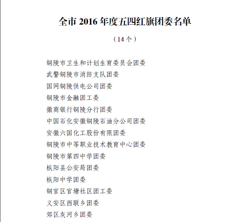 在纪念建团95周年暨五四运动98周年之际,共青团铜陵市委员会下发了《关于2016 年度全市共青团工作先进集体和先进个人名单的通报》,我校团委喜获2016年度铜陵市“五四红旗团委”荣誉称号。