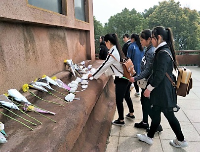最后全体师生向烈士纪念碑敬献自己亲手制作的白花,并有序的绕场一周瞻仰革命先烈,整个过程在苍松翠柏掩映下显得格外的庄严肃穆。