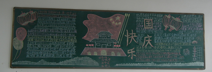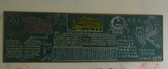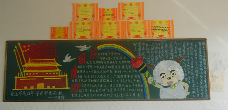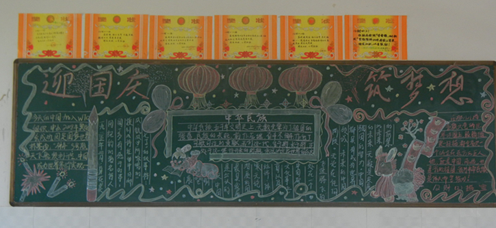 十月份,我校以“迎国庆 筑梦想 践行社会主义核心价值观”为主题进行班刊评比。经过各班主任的精心组织,各班学生的认真设计,黑板报主题鲜明,图文并茂的歌颂了祖国65年来取得的伟大成就,加深广大学生对新中国辉煌历程和社会主义核心价值观认识,激发为中华民族伟大复兴中国梦而发奋努力的决心和信心。