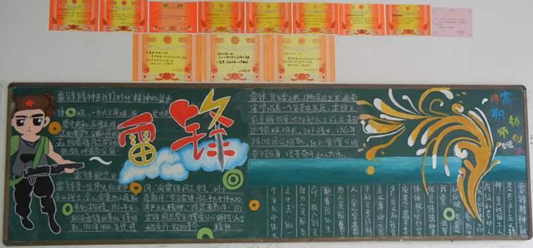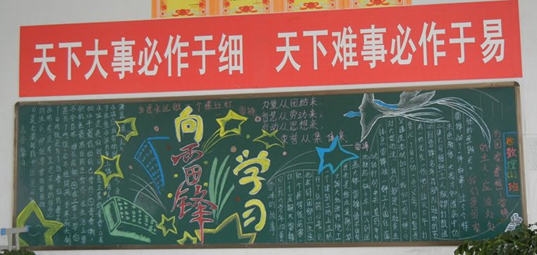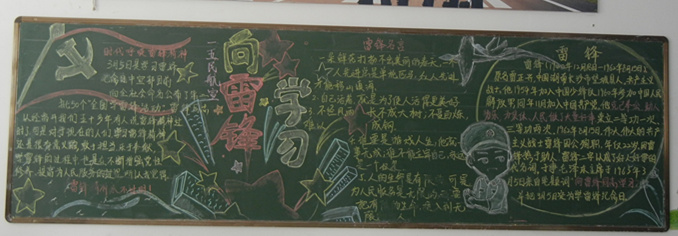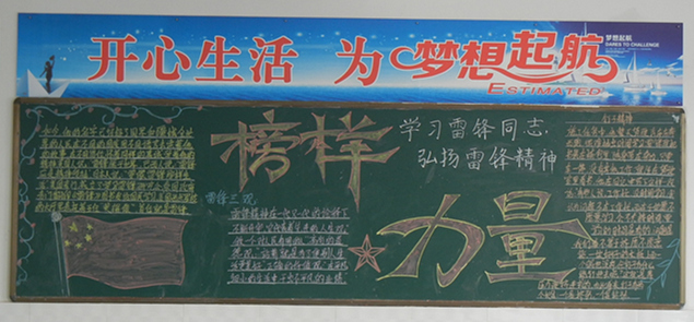 三月份,我校以“弘扬雷锋精神·构建和谐校园”为主题进行班刊评比。经过各部和各班主任的精心组织,各班学生的认真设计,黑板报主题鲜明,版面设计生动活泼,介绍了雷锋生平,传颂了雷锋故事,讴歌了崇高的雷锋精神,唱响了时代主旋律,在全校营造出积极向上的良好氛围。