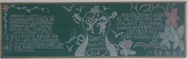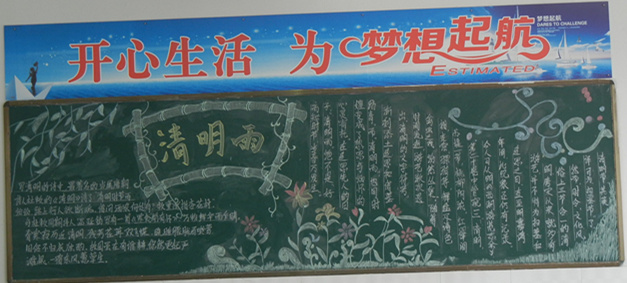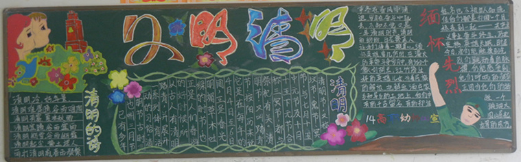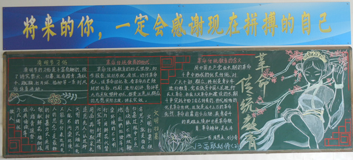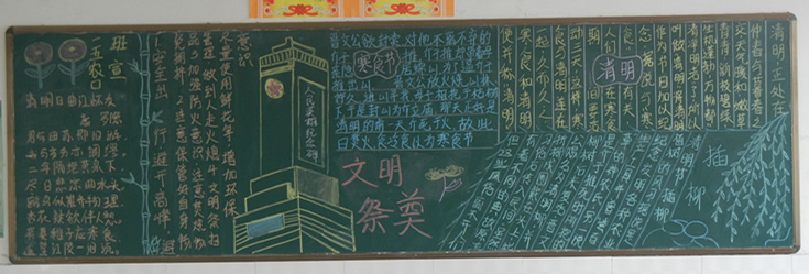 为进一步深入开展“我们的节日·清明”主题教育活动,创建和谐校园,展示学生的风采和能力,日前,我校举行了以“文明祭扫”为主题的黑板报评比活动。